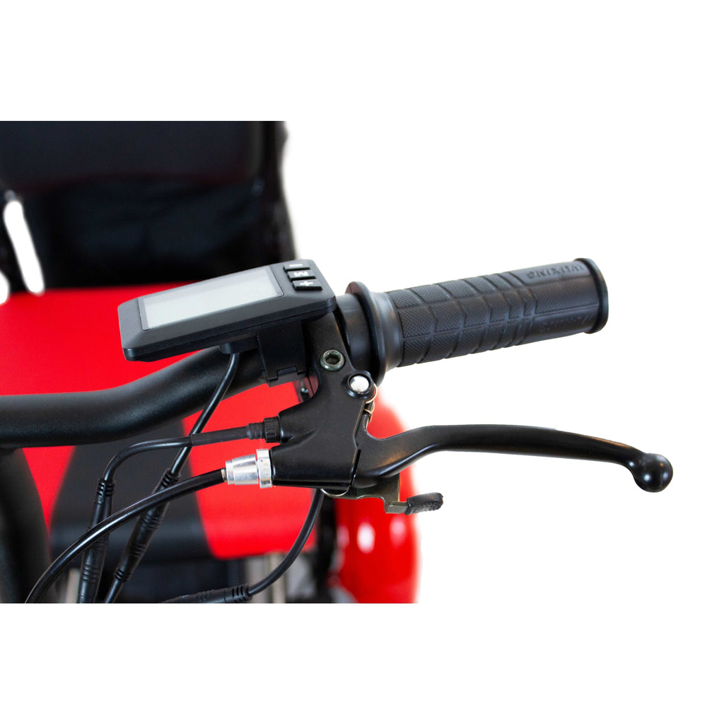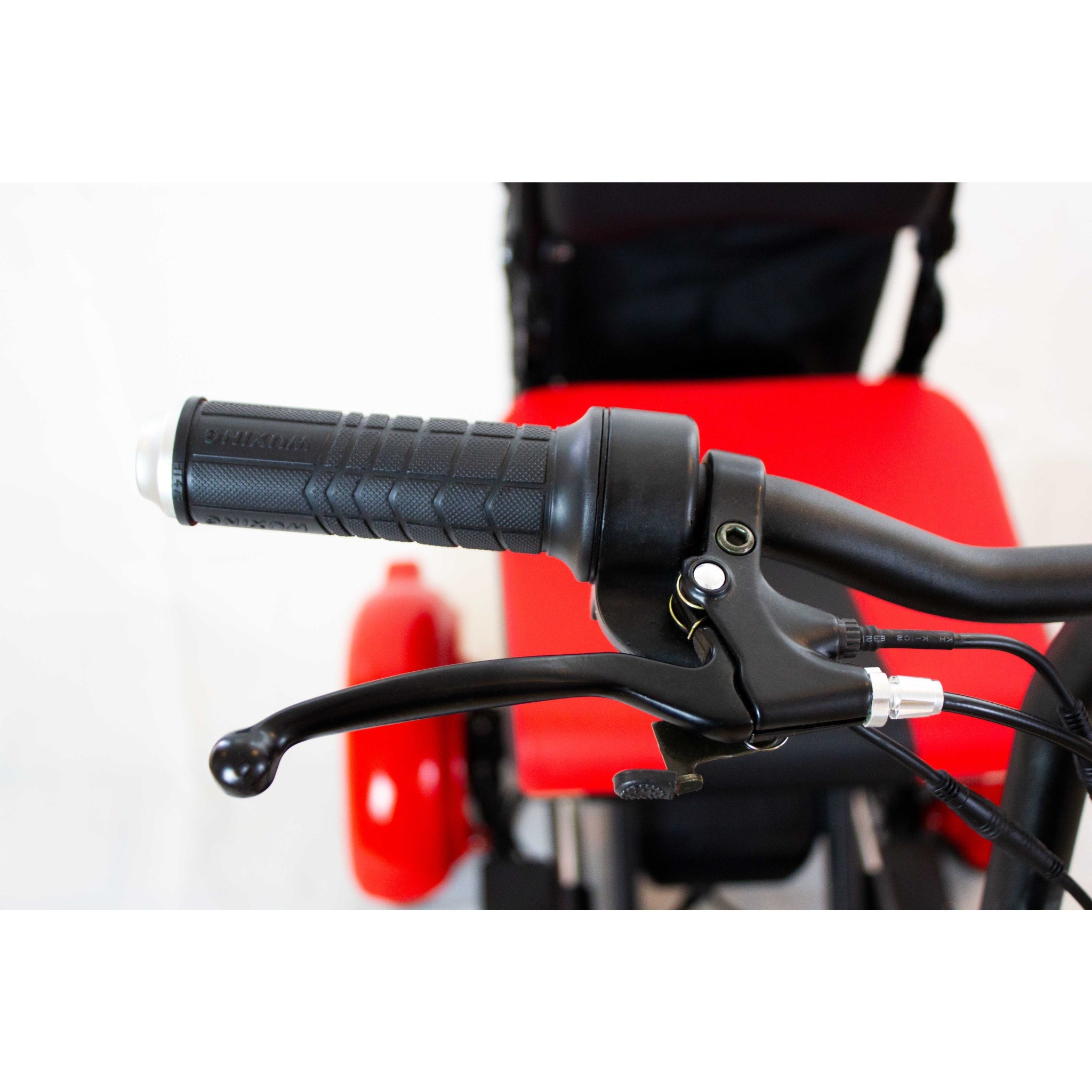 Die Geschwindigkeit wird über einen Gasgriff (rechts) geregelt und zwei Handbremshebel verzögern die Fahrt zuverlässig. Die beiden kräftig zupackenden Scheibenbremsen an der Hinterachse in Verbindung mit der vorderen Trommelbremse bringen Ihren „Mobot“ jederzeit problemlos zum Stehen.