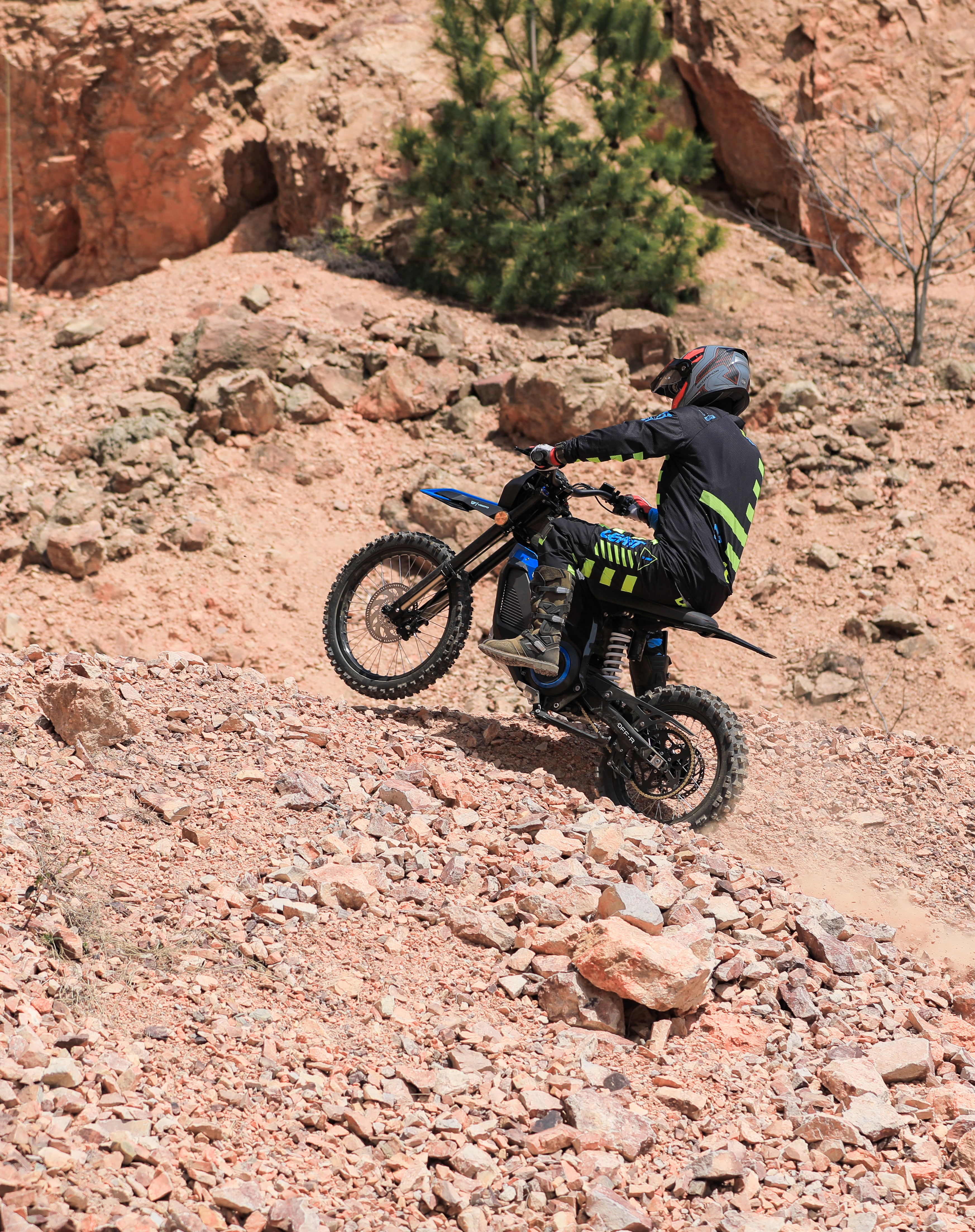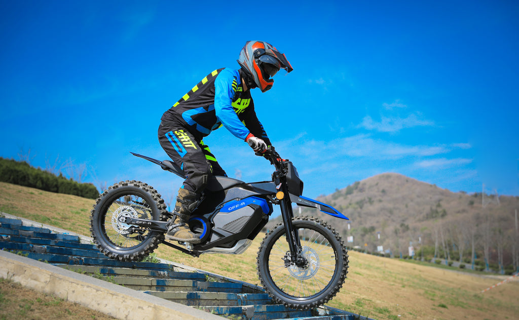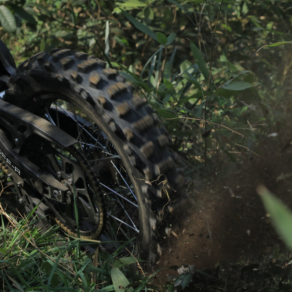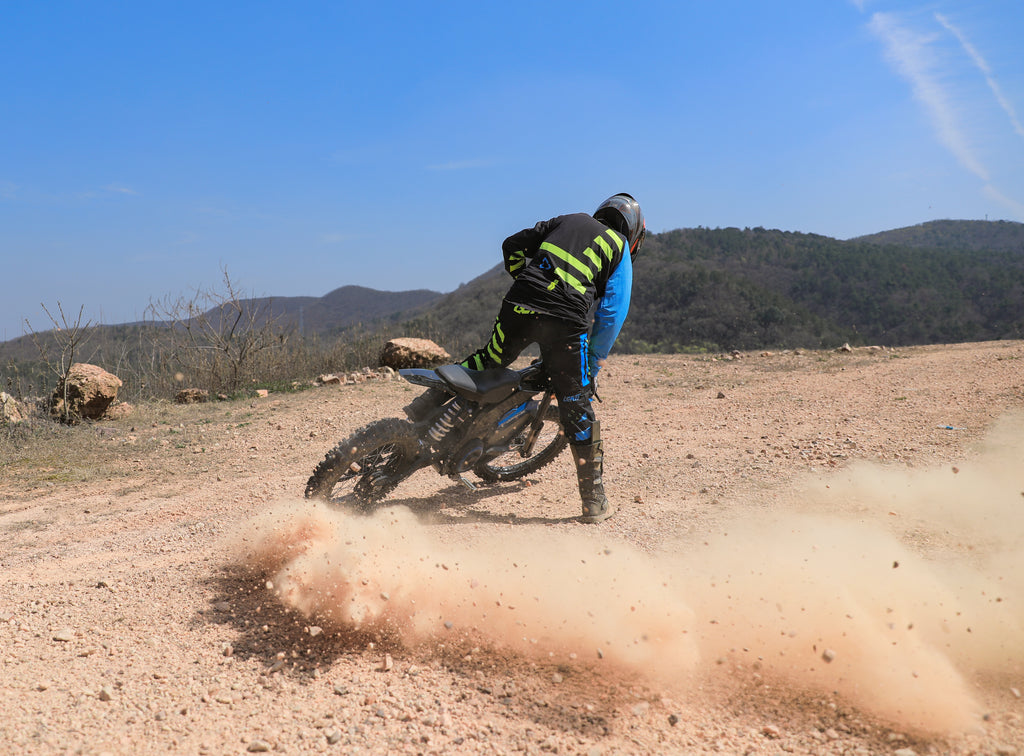 Die Hinterradfederung ermöglicht die bestmögliche Dämpfung von Schlaglöchern und Steinen, die Motorschutzabdeckung schützt die Karosserie des elektrischen Dirtbikes vor Schlägen und Schmutz und das geringe Gewicht der Maschine ermöglicht es auch jüngeren Fahrern, das Gelände zu erkunden.