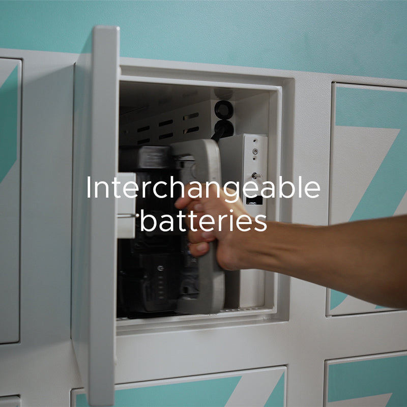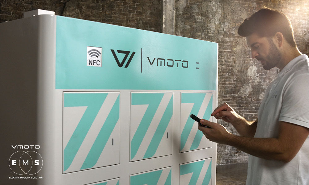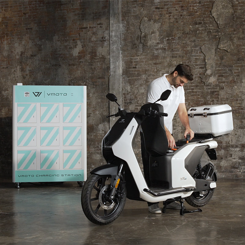 Das Produkt, das wir im Detail betrachten, ist die Wechselstation. Sie wurde entwickelt, um die Batteriebestände bei Händlern zu minimieren und die Ladezeiten drastisch zu verkürzen. Durch die Kompatibilität zwischen der alten Batterie und dem neuen 74-V-Batteriesystem entstand die Vmoto-Wechselstation. Sie können den Ladevorgang und die Verfügbarkeit der Batterie überwachen, indem Sie den Schrank mit der Vmoto Fleet Platform verbinden.